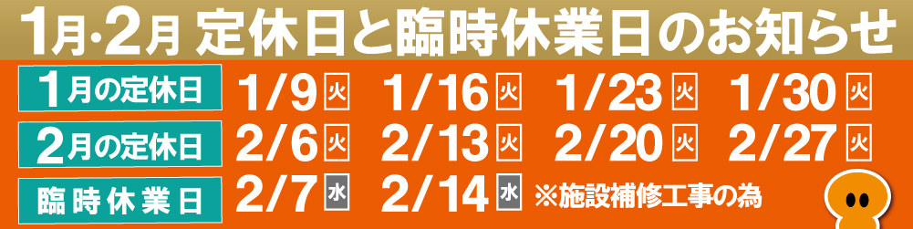 施設補修工事の為、定休日に加え、 2月7日(水) と 2月14日(水) を 臨時休業いたします。