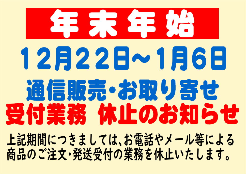 年末年始は、通信販売・お取り寄せ受付業務を休止します。(12/22~1/6)