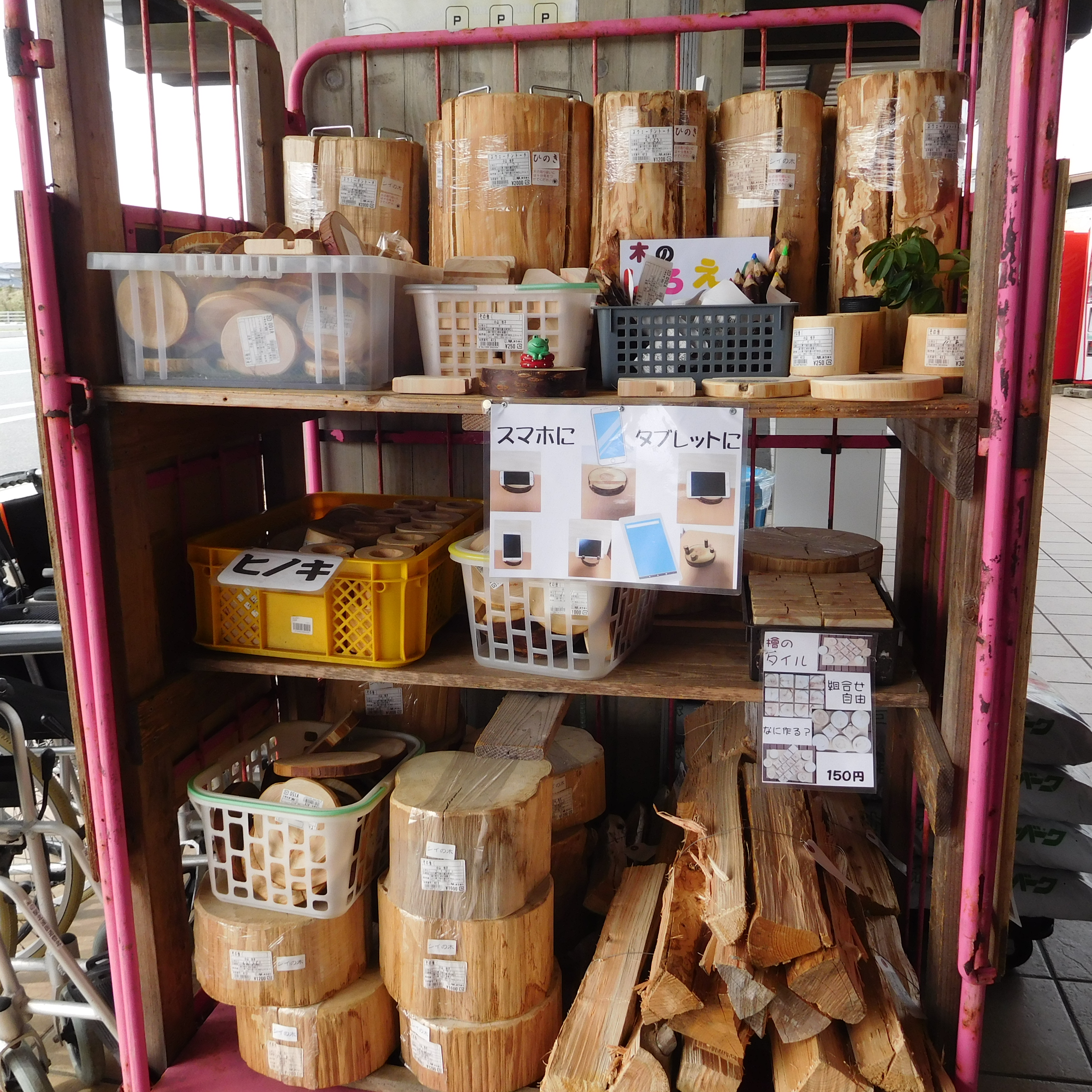 道の駅の交流広場にコンテナの中に様々な木の薪や丸太、スウェーデントーチなども販売しています。その中には木で作った木工商品もありました。今までは主にコースターを販売していましたが、今はスマホやタブレット置きにアレンジしたものも販売しています。