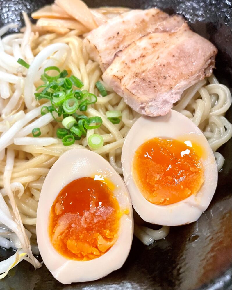 厚めのチャーシューは炙ってあり、卵は半熟です。