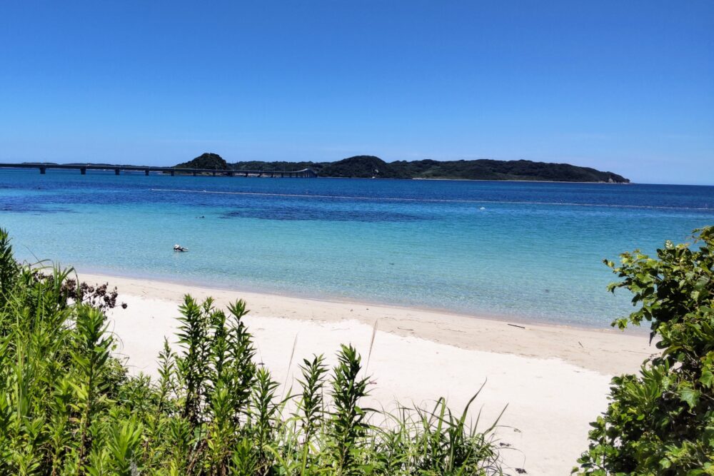 角島の対岸、ホワイトビーチ島戸(旧 島戸海水浴場)は、角島大橋がすぐ目の前。白い砂浜と青い空、水面は夏の日差しを受けて波がキラキラ☆