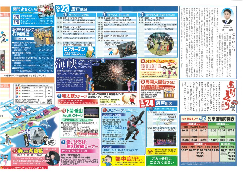 さて、今日8月23日(土)と明日24日(日)、下関市街地では「馬関(ばかん)まつり」が開催されます。下関駅周辺から唐戸にかけては、混雑が予想されるので、時間に余裕をもってお出かけください。