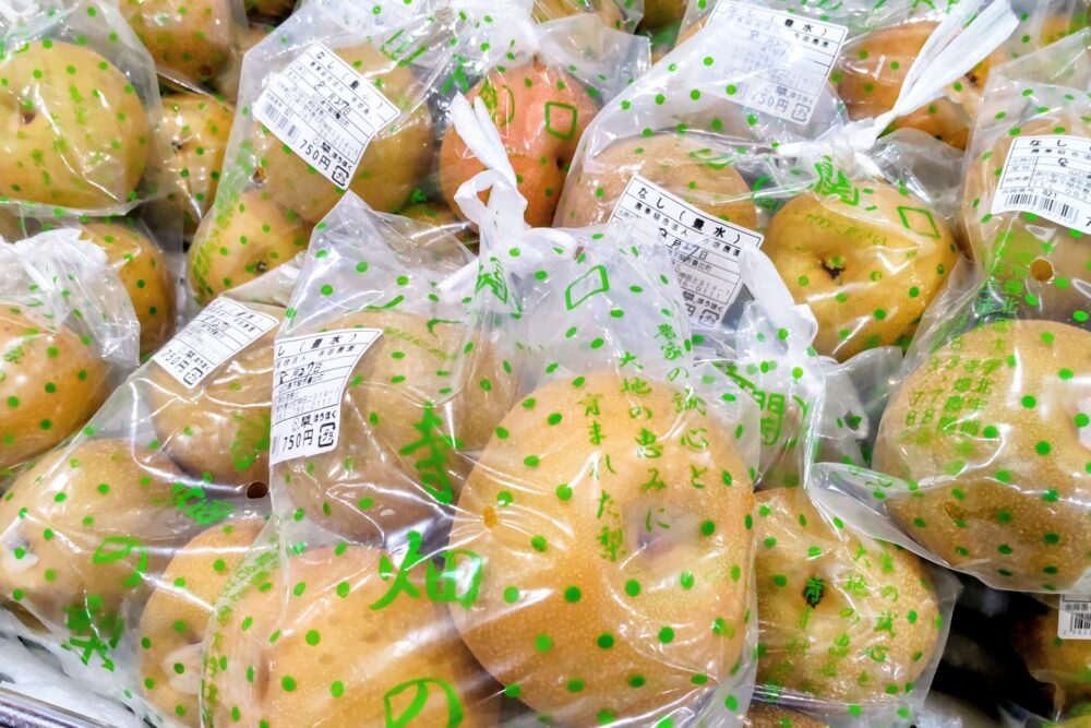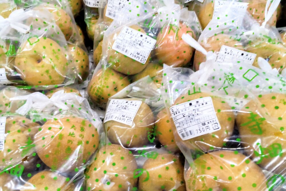 今日は寺畑農園から、今年初の「豊水(ほうすい)」が届きました。豊北梨の代表です。早速、たくさんのお客様が集まって来られました!