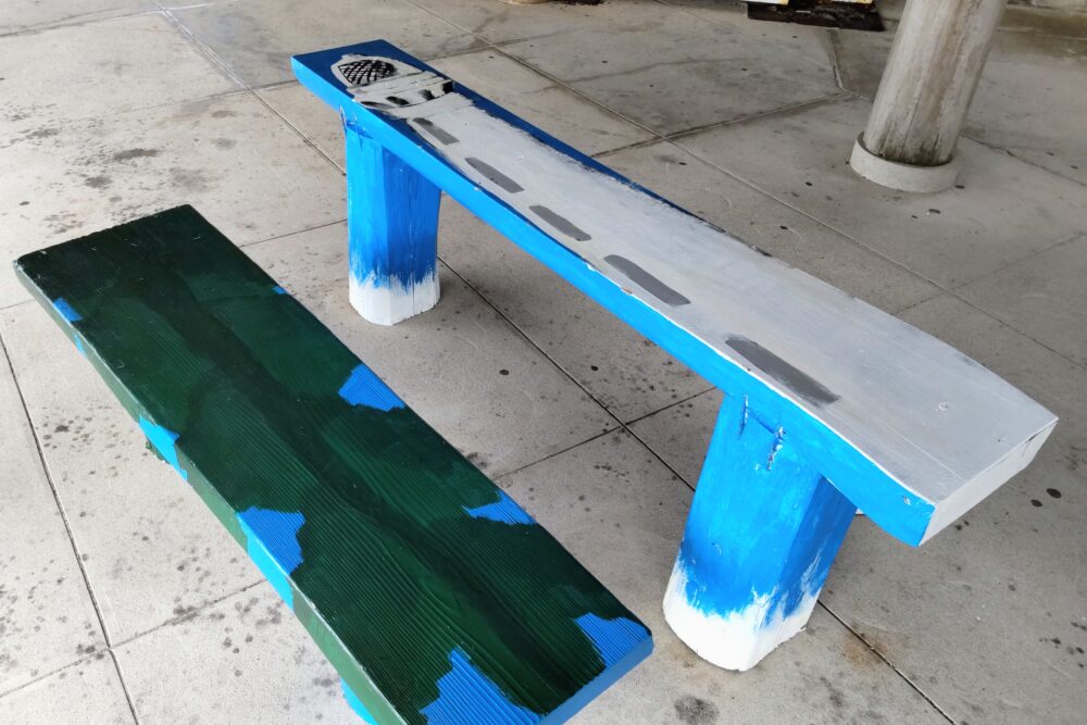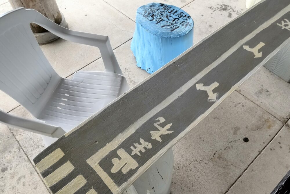 道の駅ほうほくから車で約15分、豊北町角島にあるしおかぜの里角島の、駐車場からは階段とスロープの先、軒下広場にある木製のテーブルとベンチ。この度、下関北高校総合文化部により、デザインがリニューアルされたと聞いて、見に行きました。