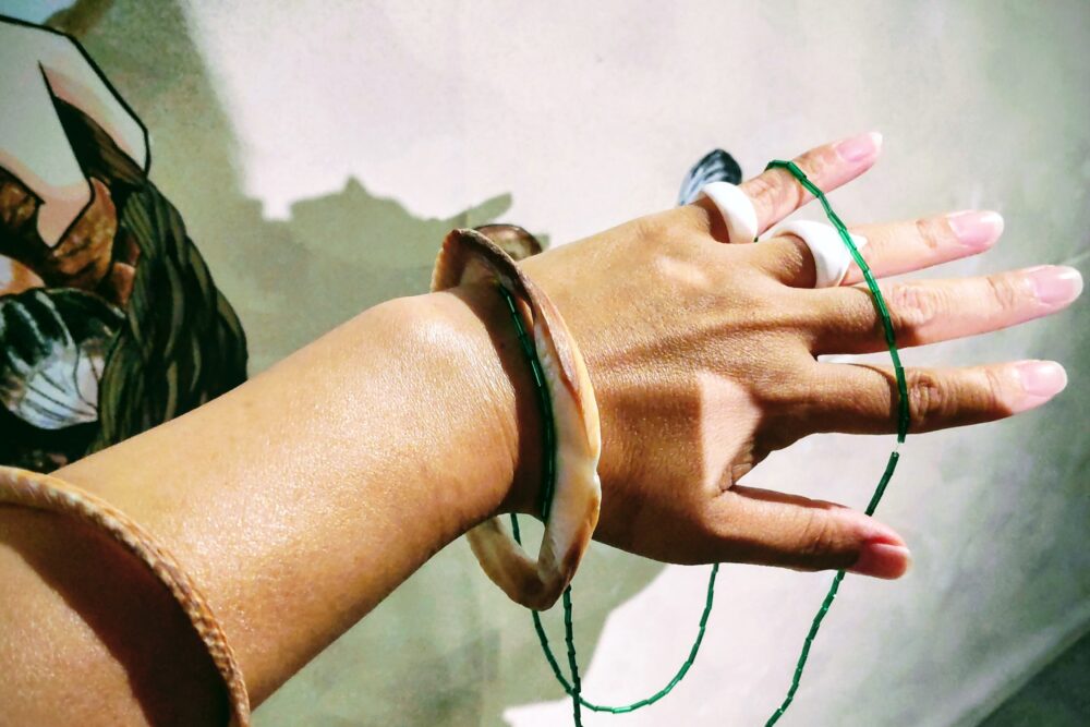 貝で作られた腕輪や指輪、管玉のネックレスなどのアクセサリー、弓矢や石斧といった小道具も用意されています。服の上から着ることができるので、気軽にお試しできます。アクセサリーは、受付にお申し出ください。