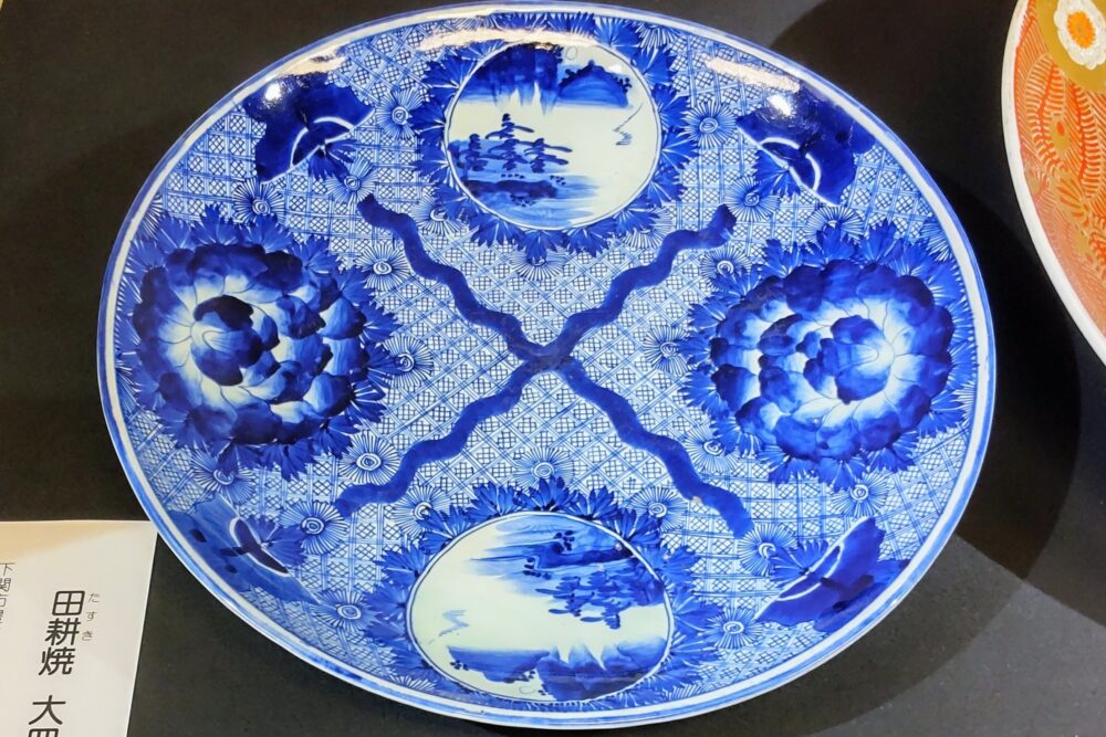 菜香亭の大広間には、井上馨や佐藤栄作など著名人の扁額29枚と、ゆかりの所蔵品が展示されています。その中に、豊北町田耕(たすき)で作られた「田耕焼」がありました!
