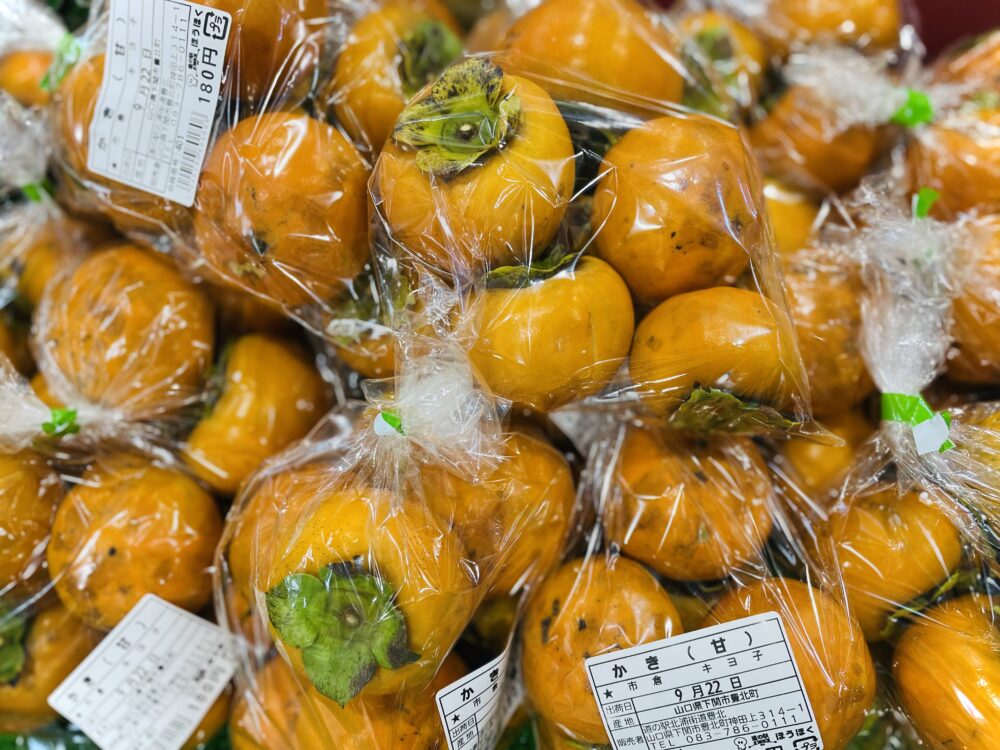 山盛りの柿を売場に並べていた生産者の市倉さん(豊北町)、