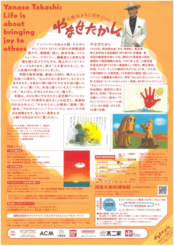 さて、『あんぱん』は本日で最終回を迎えましたが、周南市美術博物館では「やなせたかし 人生はよろこばせごっこ」が11月14日(金)より開催予定です。