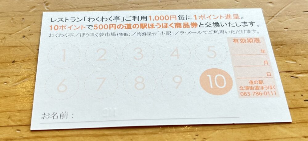 お食事1000円につき1ポイントで、10ポイント貯まりますと道の駅豊北で使える商品券500円分と交換です。
