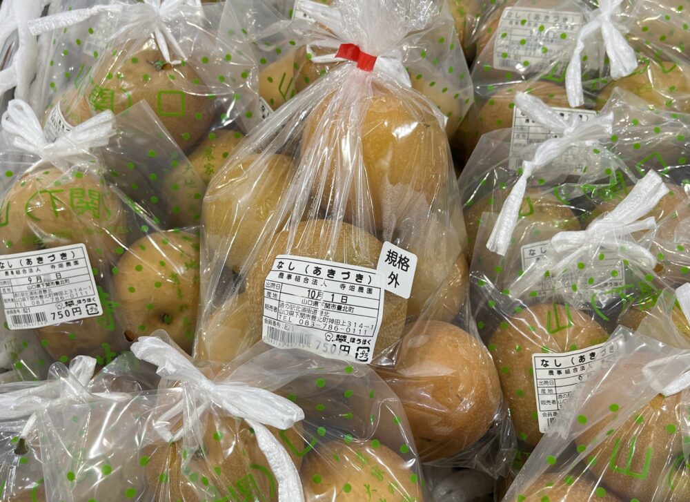 道の駅北浦街道豊北では、寺畑農園さんの規格外のなしを通常よりお得に販売しております。