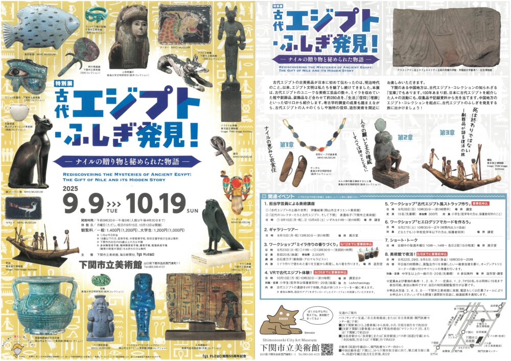 道の駅ほうほくから車で約1時間、下関市長府にある、下関市立美術館で開催中の特別展「古代エジプトふしぎ発見!-ナイルの贈り物と秘められた物語-」に行きました。下関市立美術館は、戦前に活躍した呉服商・河村幸次郎(1901~1994)が蒐集した日本近代絵画や古代オリエント工芸が数多く収蔵されていて、「河村コレクション」と呼ばれています。実は下関には、古代エジプトの品が、たくさんあるのです!