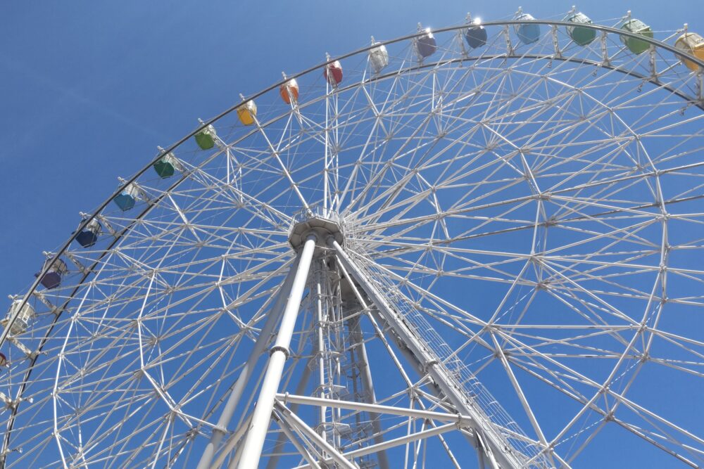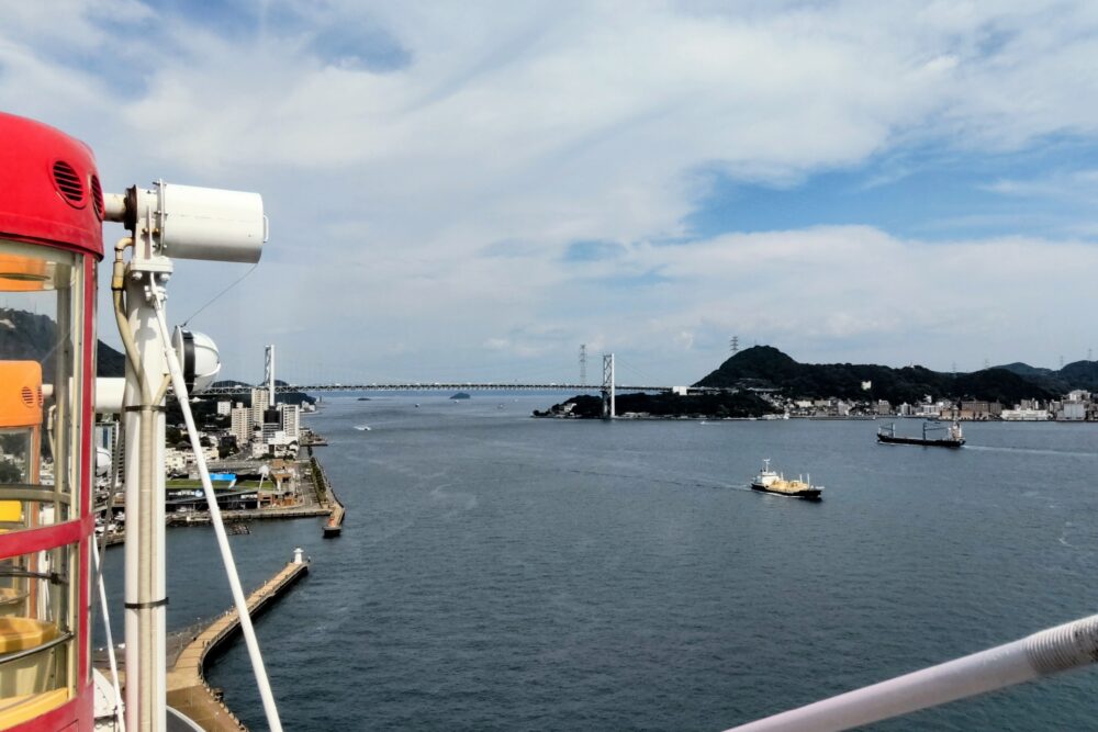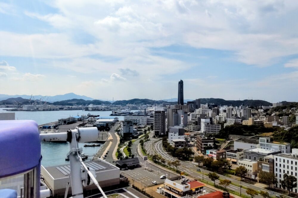 先日、道の駅ほうほくから車で約1時間、はい!からっと横丁で大観覧車に乗りました。晴天で、全高約60mの上空から、関門海峡や下関の市街地を眺めることが出来ます。