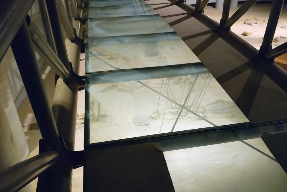 土井ヶ浜遺跡の出土状況を再現した土井ヶ浜ドームには、シースルーの通路もあり、人骨が出土したようすを、上から見ることができるようになっています。日本人のルーツに興味がある方は、ぜひ覗いてみてください☆