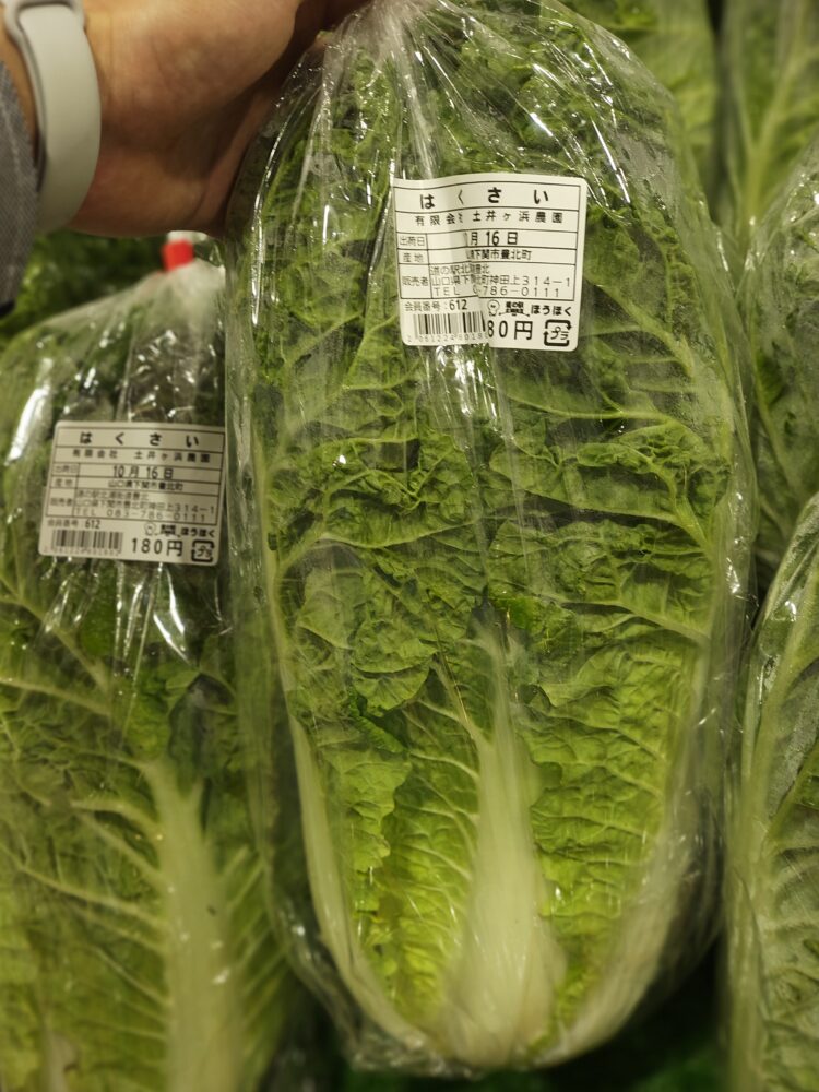 今朝の入荷で驚いたのはすぐご近所の土井ヶ浜農園さんが出荷された葉物たち。キャベツの他に大きなレタスや立派な白菜が並びました。