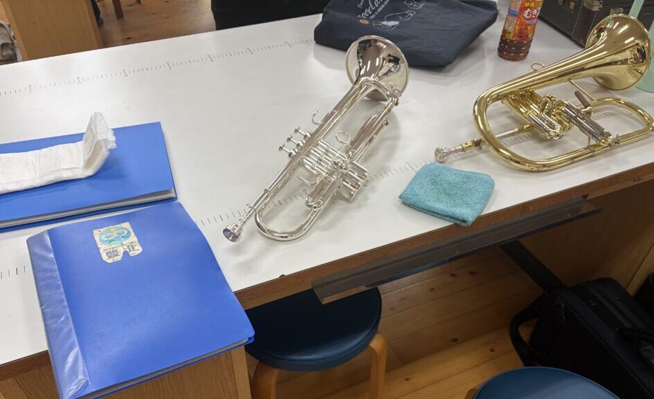 今年は豊北中の吹奏楽部と豊北吹奏楽団の合同演奏、そして同じく豊北町内で活動している「コーラスすみれ」さんの合唱など、地域の大人も参加するという事で。私は一応この豊北中学校の卒業生なのですが、まさか大人になっても同じ校舎でラッパを吹いているとは。控室は一番奥の家庭科室で朝から音出しなど。豊北吹奏楽団の楽譜はこの青いファイルに豊北町のステッカーです。