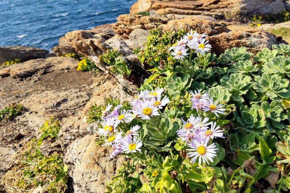 道の駅ほうほくから車で約15分、豊北町角島にある牧崎風の公園では、ダルマギクがそろそろ終わり。でも、まだ場所によっては、薄紫色のきれいな花が楽しめました。