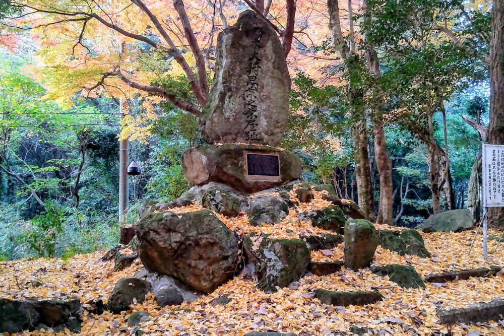 道の駅ほうほくから車で約15分、下関市豊北町粟野市ノ瀬にある「乃木大将思案之茶屋趾(のぎたいしょうしあんのちゃやあと)」では、銀杏が散り始め。滝部から粟野に抜ける県道39号線の途中、粟野峠を越えたところの石碑です。
