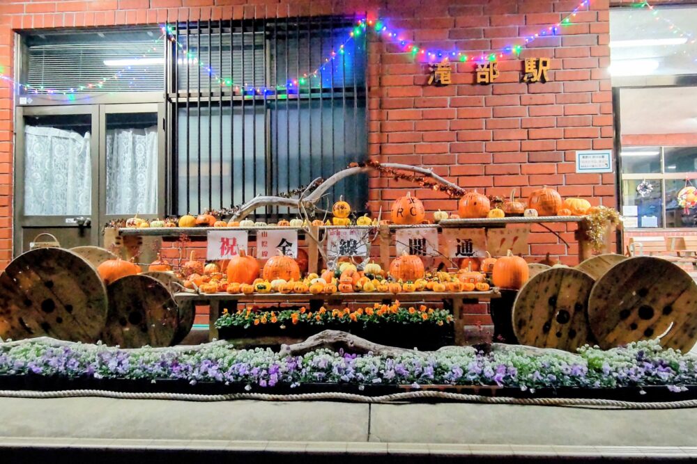 クリスマスが近づいて、各地でイルミネーションが始まっています。道の駅ほうほくから車で約10分、JR滝部駅では、下関北高校生が、滝部駅や総合支所、豊北町村おこし物産振興協同組合、司ガーデンと協力して、「よみがえれ!通学の町プロジェクト」として、先月からのかぼちゃオブジェに加え、イルミネーションを設置しました。