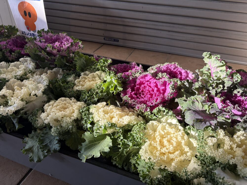 店内入り口前の交流広場にも朝日が差し込みます。葉ボタンも日光のある方が良いのでしょうか。
