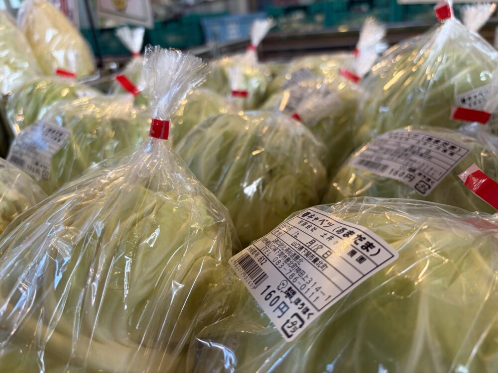 向かいのワゴンには食べられるほうの葉っぱ、もといキャベツと白菜が並びます。そちらは日陰で良く冷えてます。
