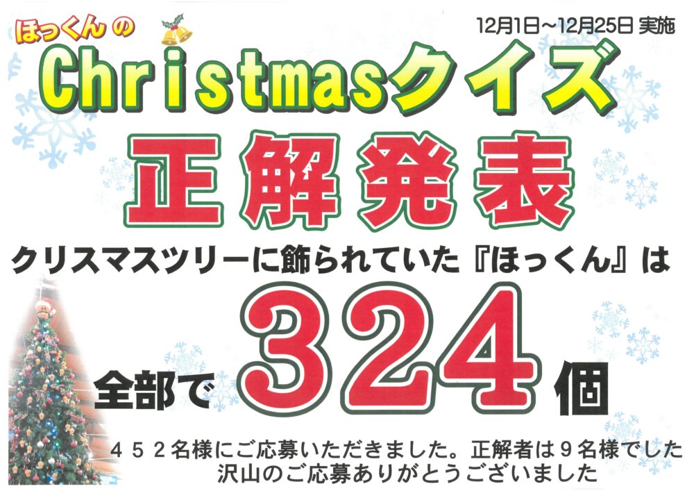 さて、12月1日から25日にまで開催していました年末特別企画クリスマスクイズ『クリスマスツリーにほっくんは何個?』も無事に昨日終了しました。