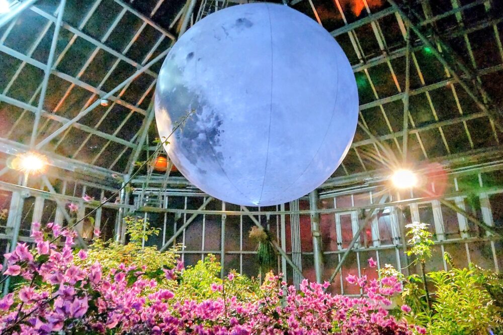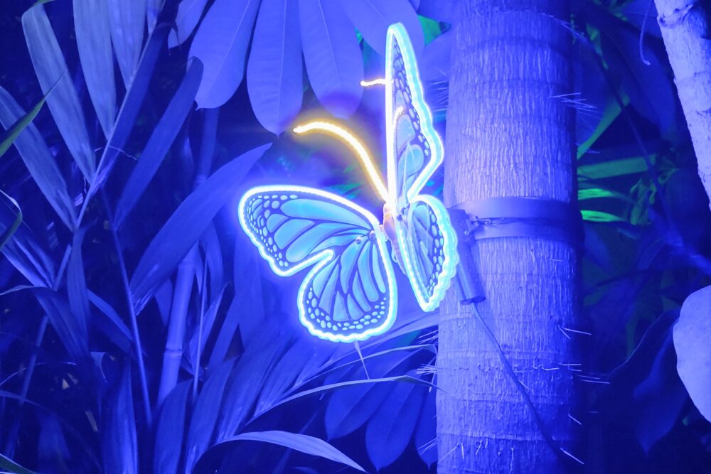 熱帯エリアでは直径3.5mの大きな月の周りを光る蝶が飛び回り、サボテンエリアではレーザーショー。中庭エリアでは、ときわ公園開設100周年を記念し、三日月のまわりに100匹の光る蝶が登場します。華やか☆