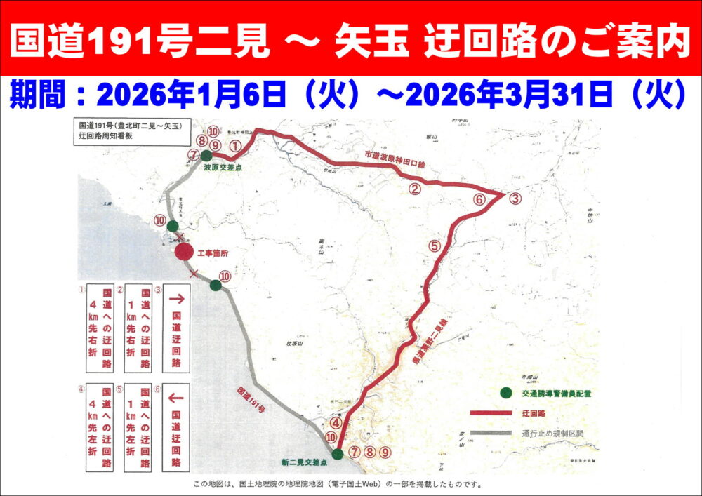 明日1月6日(火)から3月31日(火)まで、下関市豊北町矢玉近くの国道191号上で道路防災工事が行われます。波原交差点と新二見交差点の間は、矢玉や津波敷などの地元関係車両のみ通行可となります。