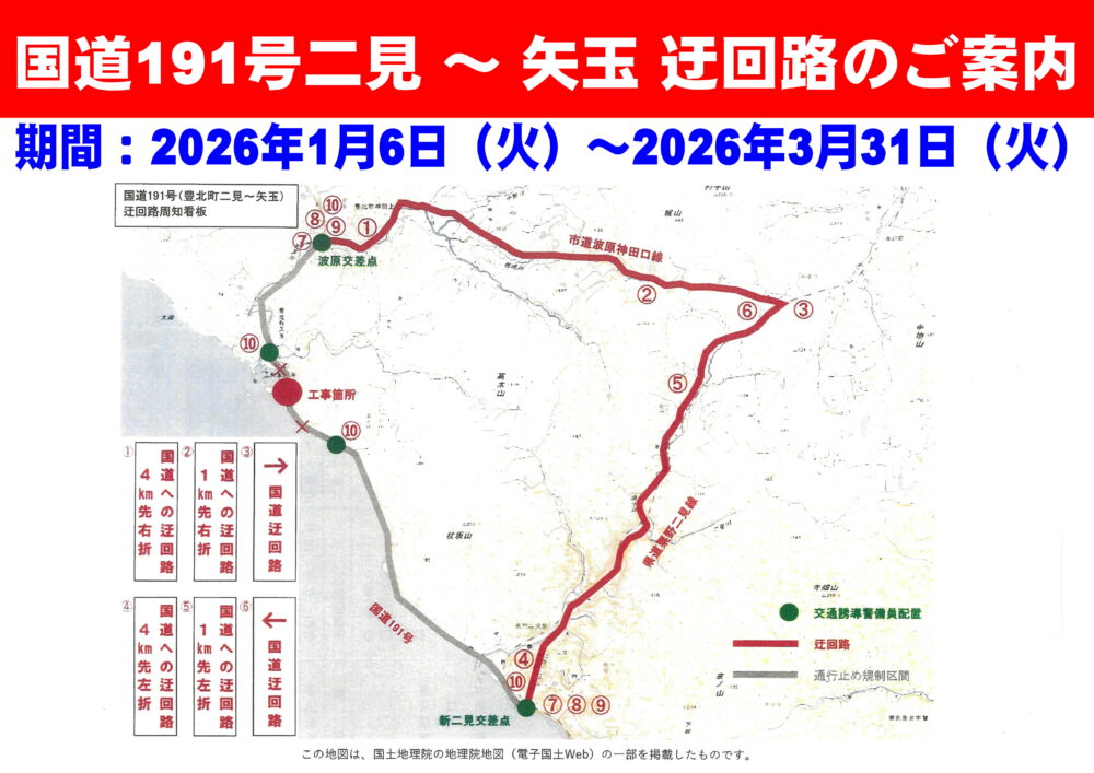 1月6日から3月31日までの予定で、国道191号線・豊北町二見~矢玉間において道路工事が行われます。