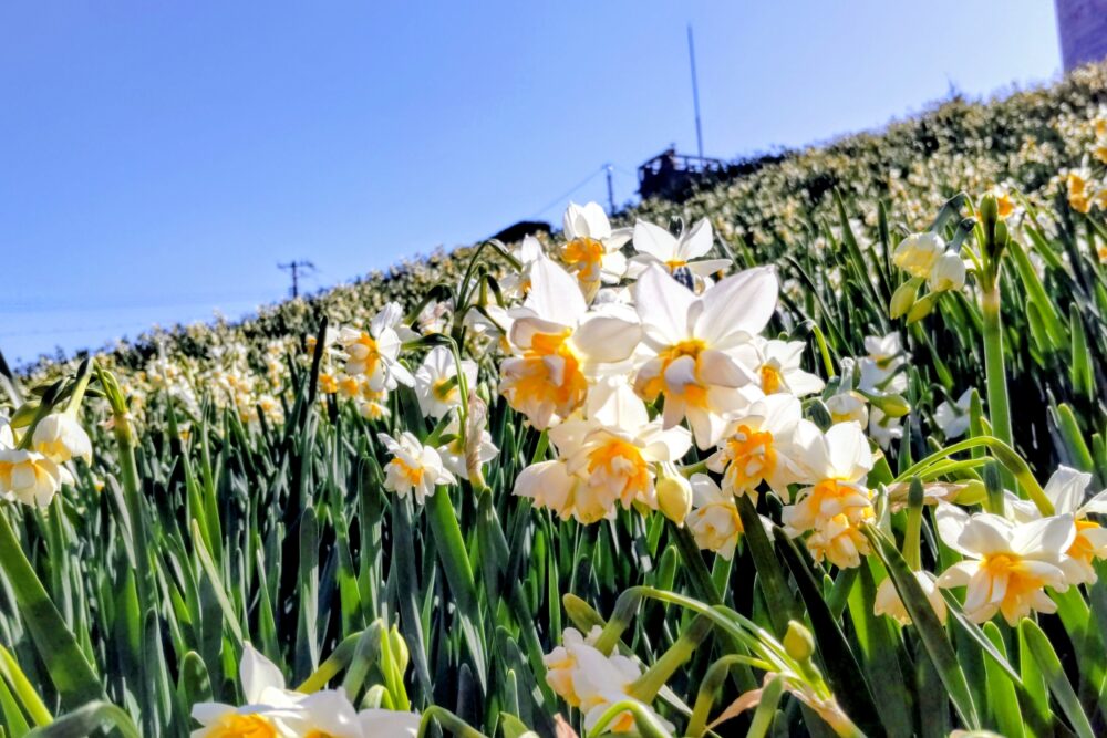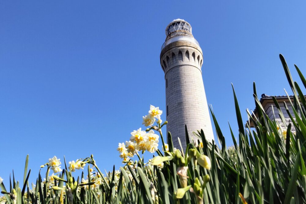 昼間は、晴れた青い空と青い海に、白い灯台と水仙が映えますね。寒いですが、撮影に訪れる方も多いです。