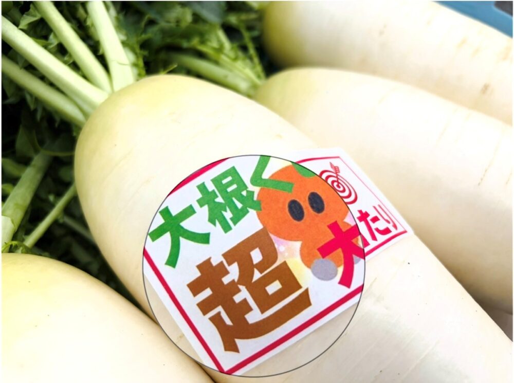 今年の大根は、出荷者の中嶋さんにご協力をいただいて、 豊北町産の「三太郎大根」をご用意しました! こんなに立派な大根が100円ですよ👀 ちょっと、信じられない✨✨✨
