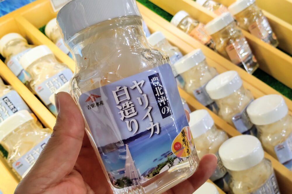 道の駅ほうほくには、白い綺麗なイカの瓶詰があります。塩味を控えて甘口の、あっさりめに味付けで、お刺身感覚で食べられる薄塩塩辛です。ぜひ味わってみてください🦑