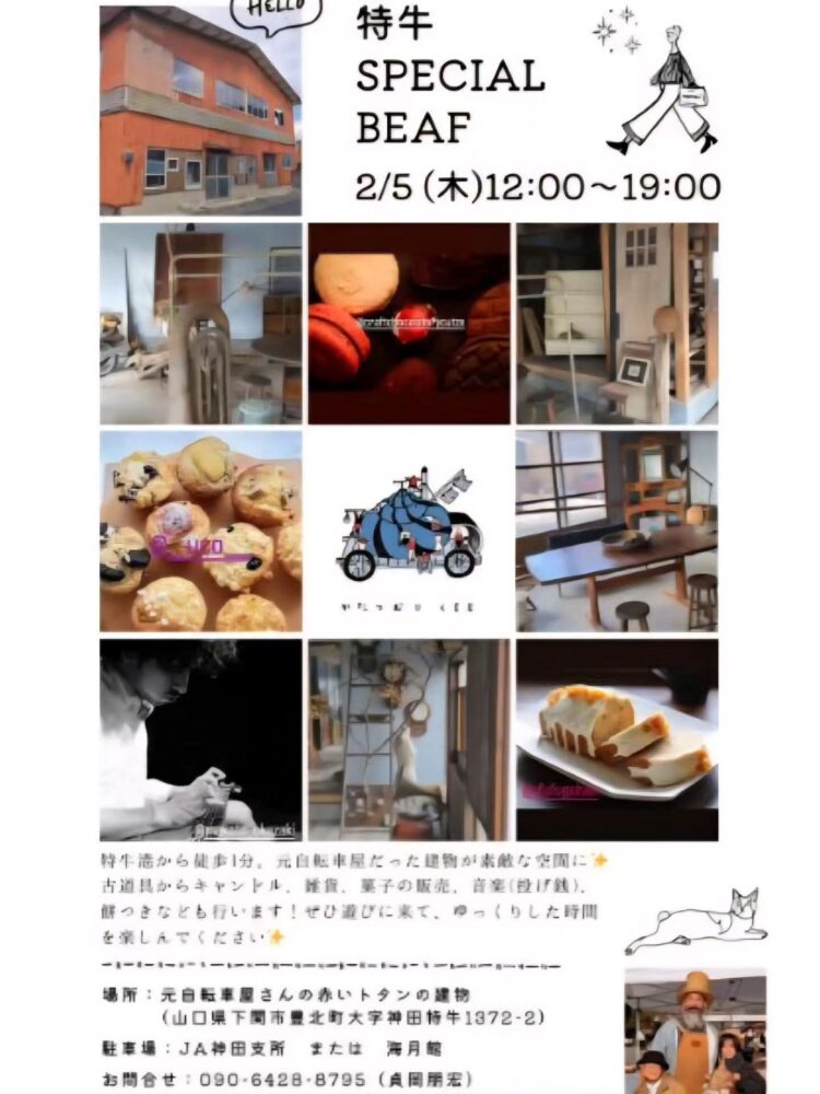 2026年2月5日(木)12時~19時、イベント「特牛SPECIAL BEAF」が開催されます。特牛のJA神田支所に向かう信号を曲がって集落に入り、ひとつめの角にあります。駐車場はJAまたは海月館前。お菓子や雑貨などの出店、お餅つきやギターライブなど。ぜひお立ち寄りください!