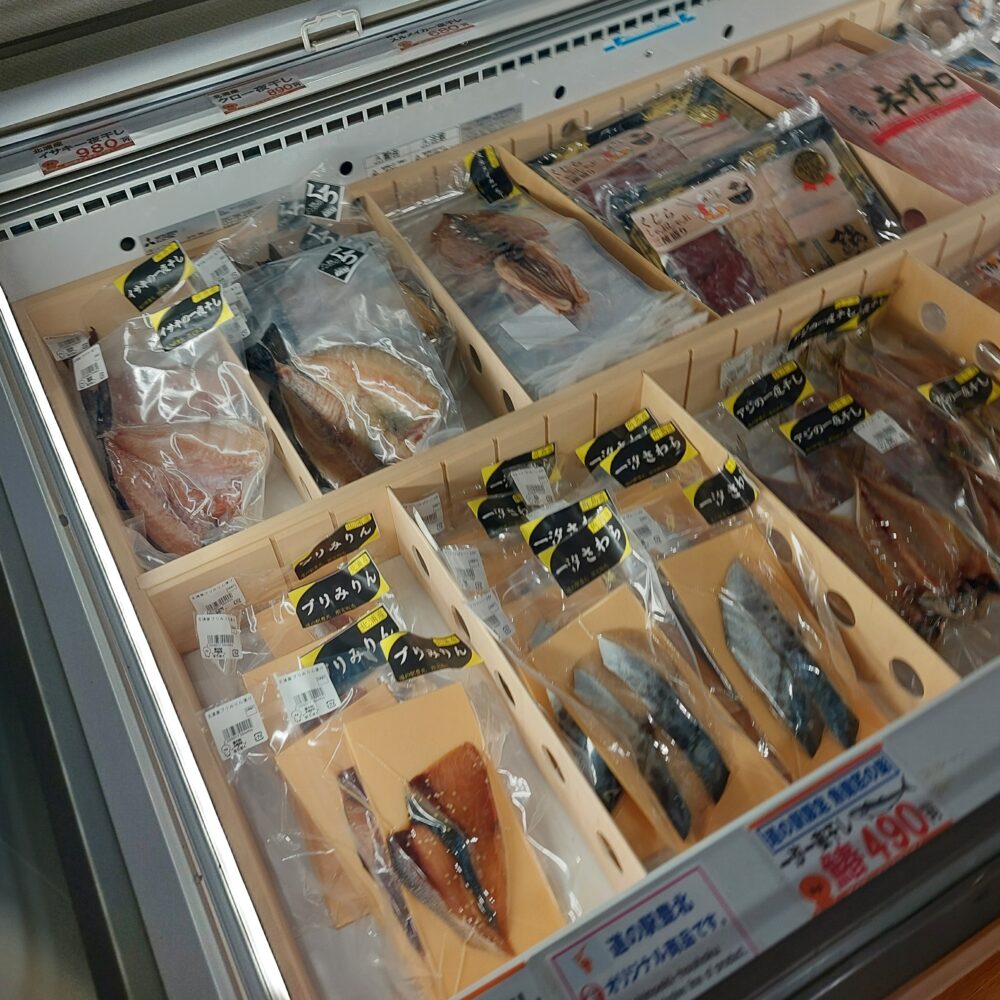 他にも鮮魚コーナーの奥にある冷凍ショーケースには、お酒の肴にも、おかず一品にもなる「さわら一汐」や「ぶりみりん」「あじ一夜干し」なども販売しております。