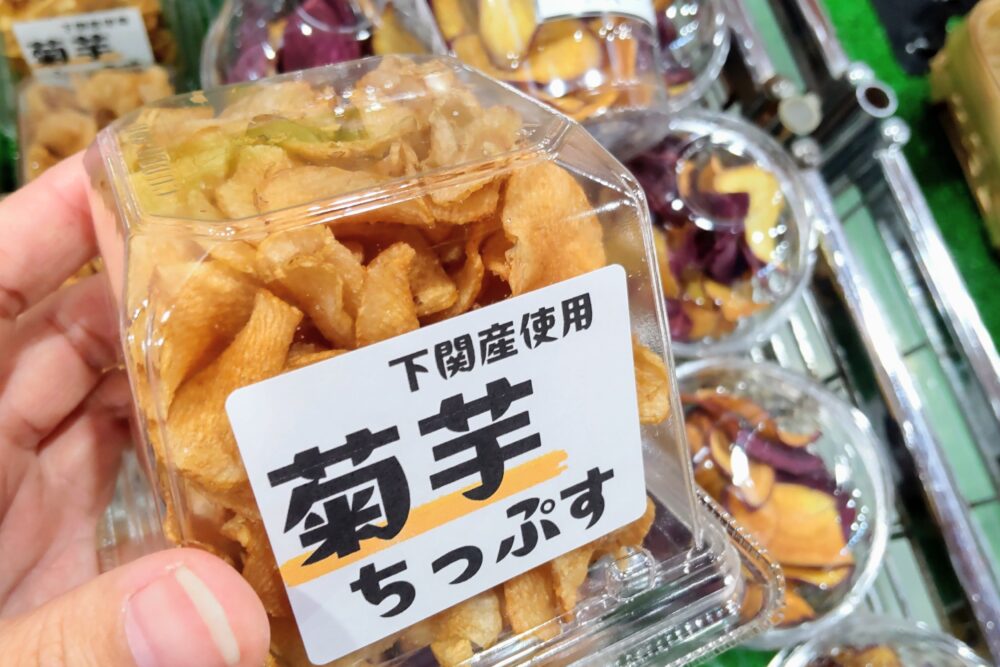 道の駅ほうほくには、四つ葉農園さんの豊北町産さつまいもを使った「しあわせるチップス」や「菊芋ちっぷす」が並んでいます。ぜひどうぞ☆