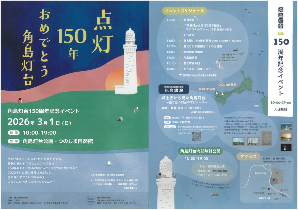 つのしま自然館では、10:00~11:30(受付9:30~)、角島灯台点灯150周年記念講演。郷土史家・藤岡達雄氏による「郷土史から見た角島灯台~語り合う灯台のエピソード」、定員50名、要事前申し込み(豊北総合支所0837-782-1914)。