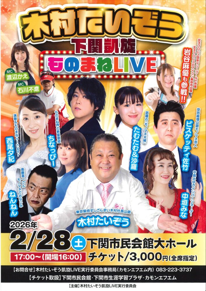 月末の2月28日(土)17時~、下関市民会館にて、道の駅ほうほくのステージイベントでおなじみの、豊北町粟野出身の、ものまね芸人・木村たいぞうさんが、下関凱旋ものまねLIVEを行います。チケット3000円、全席指定。木村たいぞう凱旋LIVE実行委員会主催。