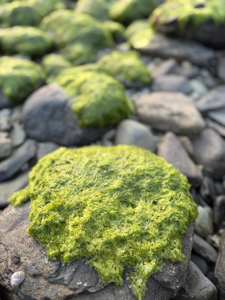 この、岩にびっしりと生えている鮮やかな海藻は何だろうか?と、 興味津々 💡
