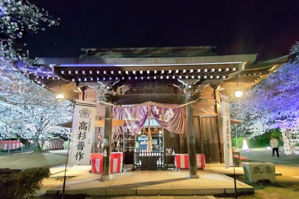 東京の靖国神社をはじめ、全国の招魂社・護国社のさきがけとなった神社です。桜山(櫻山)の名にふさわしく、桜の木がたくさんあり、春季大祭は「桜祭り」として行われます。近くには高杉晋作療養の地、高杉東行(晋作)終焉の地もあり、石碑が建っています。終焉の地では、高杉晋作の命日である4月14日にお祭りも。